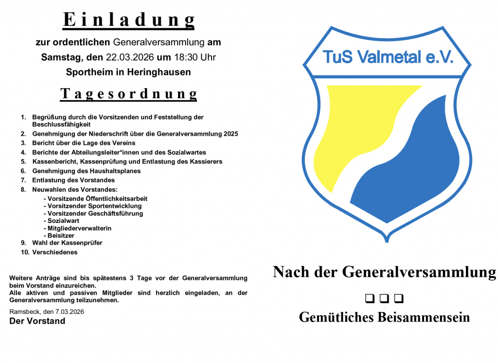 Einladung GV 2026 von stran | März 17, 2026 | Abteilungen, Aktuelles, Fitness, Förderverein, Fussball, Jugend, Lauftreff, Radsport, Schwimmen, Ski, Tennis Hier findet ihr die Einladung zur GV am 22.03.2026 ab 18.30 im Sportheim in Heringhausen.